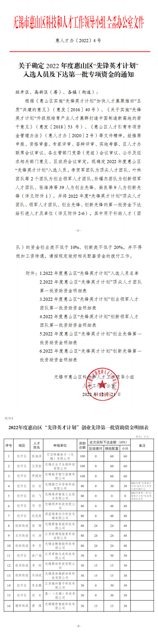 入选2022年度惠山区“先锋英才计划”
